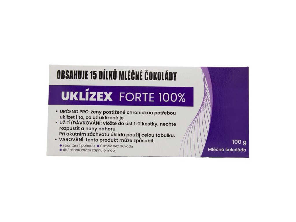 Uklízex Forte je čokoládová kúra určená všem ženám, které nedokážou odolat volání vysavače, prachovky nebo mopu. Tento „sladký lék“ přináší okamžitou úlevu od neodbytné touhy po dokonalém pořádku – stačí jen vložit kostku čokolády do úst a užít si chvilku sladkého klidu. Na obalu najdete vtipné texty: Určeno pro: ženy postižené chronickou potřebou uklízet i to, co už uklizené je. Užití a dávkování: vložte do úst 1–2 kostky, nechte rozpustit a nohy nahoru. Při akutním záchvatu úklidu použijte celou tabulku. Varování: tento produkt může způsobit spontánní pohodu, úsměv bez důvodu a dočasnou ztrátu zájmu o mop.