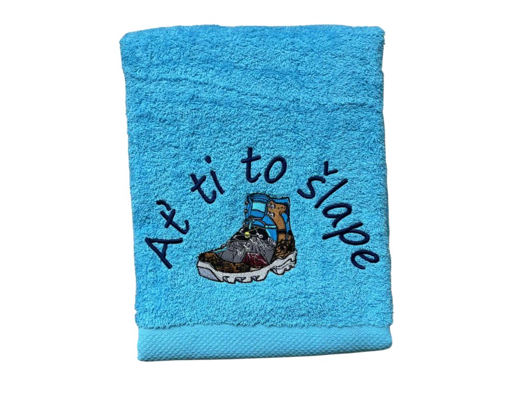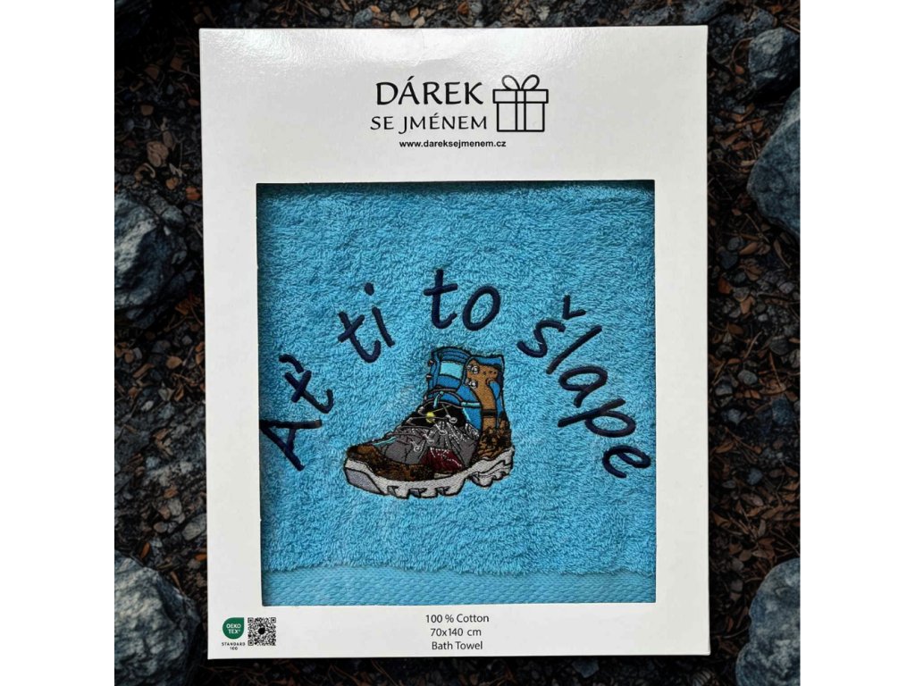 Každý krok se počítá! Tahle kvalitní osuška z 100% bavlny je ideálním dárkem pro všechny nadšence do hor, turistiky i outdooru. Výšivka s motívem turistické boty a nápisem „Ať ti to šlape“ potěší každého, kdo rád sbírá kilometry v terénu. Ať už po horách, lesních cestách nebo jen tak životem.