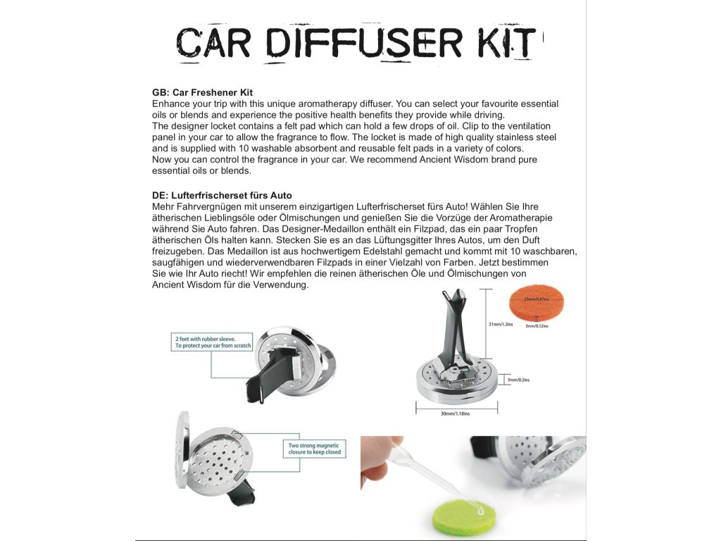 Designový medailón obsahuje plstěnou podložku, která pojme několik kapek oleje. Připevněte k ventilačnímu panelu v autě, aby vůně mohla proudit. Láhev je vyrobena z vysoce kvalitní nerezové oceli a dodává se s 10 umývatelnými a opakovaně použitelnými plstěnými podložkami v různých barvách. Nyní můžete ovládat vůni auta.