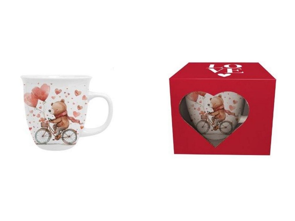 Porcelánový hrnek s roztomilým motivem medvídka na kole, obklopeného srdíčky, vnese do každého dne lehkost, něhu a kousek pohody. Ilustrace působí hravě a laskavě, díky čemuž je hrnek ideální pro chvíle klidu u kávy, čaje nebo kakaa.