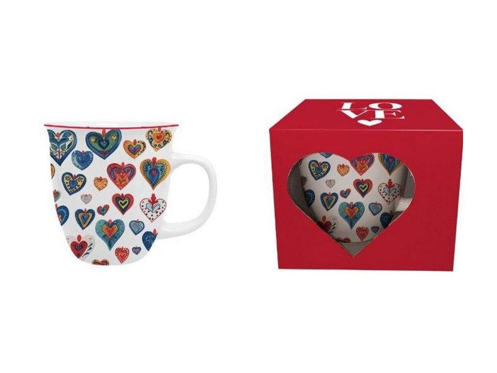 Porcelánový hrnek zdobený pestrými srdíčky v lidovém stylu přináší radost, barvy a pozitivní energii do každého dne. Hrnek působí hravě, ale zároveň vkusně