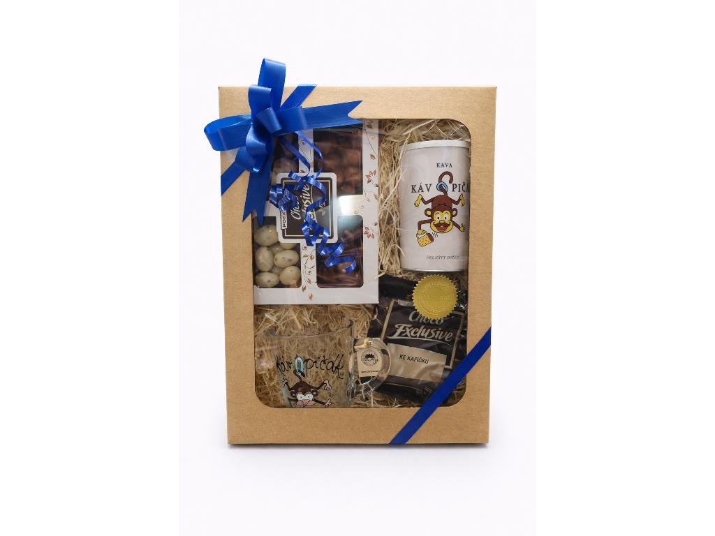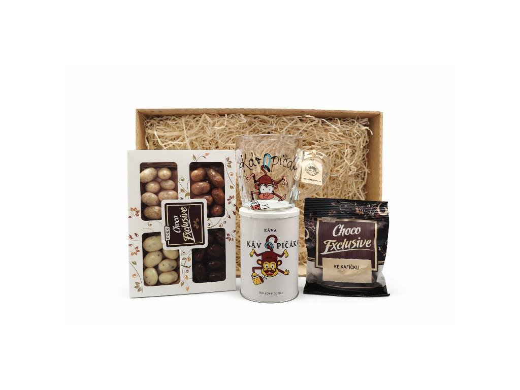 Originální dárkový box pro všechny milovníky kávy a sladkých dobrot. Stylová kombinace výběrové kávy, čokoládových specialit a veselého hrnku s motivem Kávopičák potěší jako milý dárek k narozeninám, svátku nebo jen tak pro radost.