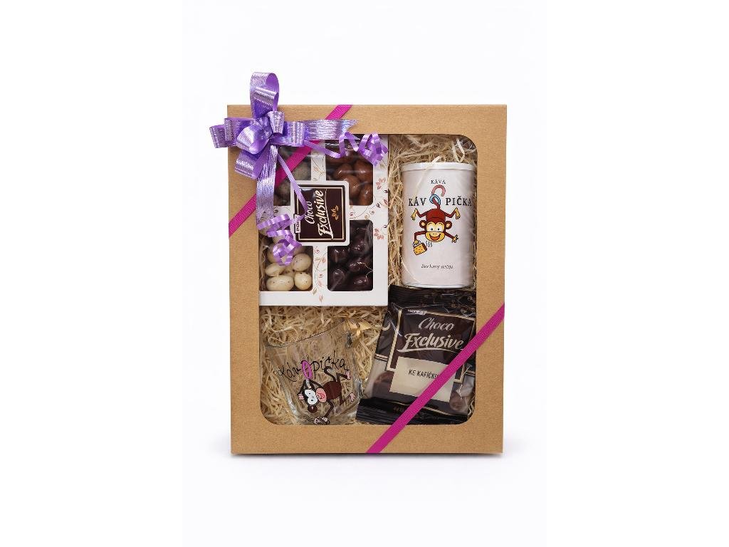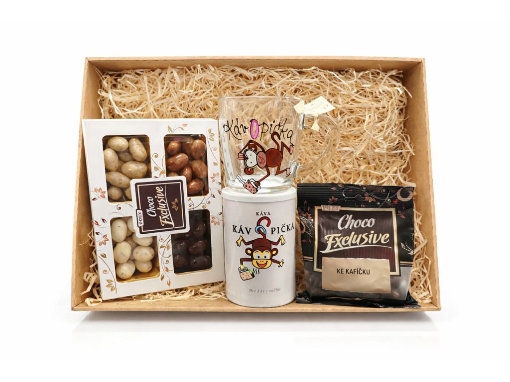 Originální dárkový box pro všechny milovníky kávy a sladkých dobrot. Stylová kombinace výběrové kávy, čokoládových specialit a veselého hrnku s motivem Kávopička potěší jako milý dárek k narozeninám, svátku nebo jen tak pro radost.