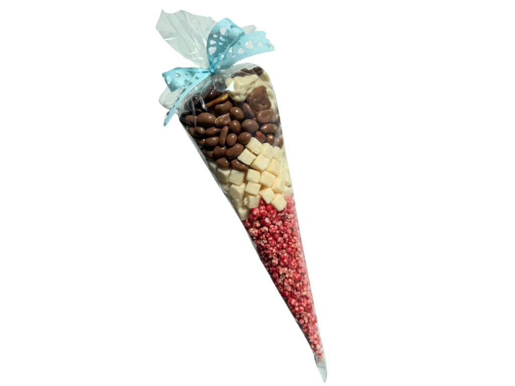 Vychutnejte si dokonalou sladkou harmonii v našem kornoutu plném exotických banánových chipsů, křupavých arašídů, lyofilizovaných malin v bílé čokoládě a jemného kokosu – to vše obalené v různých druzích čokolády pro jedinečný chuťový zážitek.