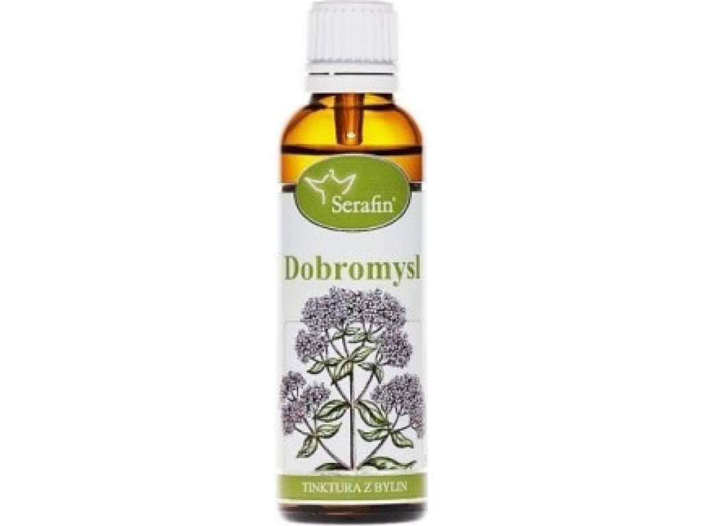 Tinktura Serafin Dobromysl je 100% přírodní rostlinný doplněk vyrobený v ČR pro dospělé, který přispívá ke klidnému spánku a podpoře trávení. Obsah lahvičky 50 ml odpovídá receptuře s 0,5 g byliny; nosičem je 40% ethanol. Dávkování: 3× denně po jídle 8 kapek v malém množství vody. Nevhodné pro děti, těhotné a kojící ženy. Uchovávejte v suchu při pokojové teplotě.