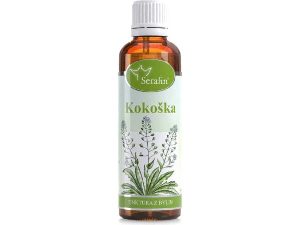 Tinktura Serafin Kokoška Shepherd 50 ml je rostlinný extrakt určený ženám pro podporu menstruačního a močového komfortu. Obsahuje výtažek z kokošky pastuší tobolky v 40% alkoholu, užívá se 3× denně po 9 kapek a balení vystačí přibližně 37 dní. Produkt je vyroben v ČR, vhodný pro vegany a lze jej kombinovat s bylinným čajem pro lepší účinek. Není určen pro těhotné, kojící ženy a děti.