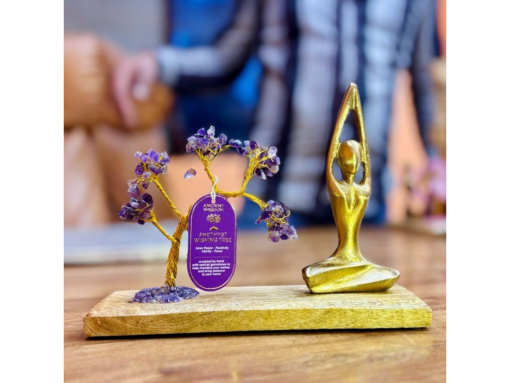 Stromek Štěstí s Jóga Figurkou na Mangovém Dřevě - Sukhasana Póza - Ametyst
